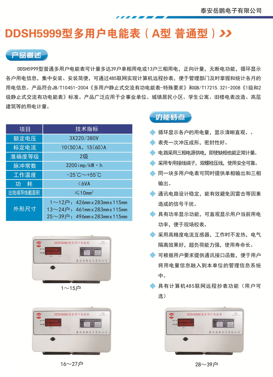 DDSH5999型多用戶電能表是采用微電子技術(shù)和表面焊接工藝生產(chǎn)的智能產(chǎn)品,可計(jì)量多達(dá)39戶單相用電或13戶三相用電,產(chǎn)品采用單片機(jī)處理系統(tǒng)實(shí)現(xiàn)數(shù)據(jù)檢測(cè),分戶計(jì)量與顯示,體積小、抗電磁干擾、功耗低、使用壽命長、智能抄表等優(yōu)點(diǎn)。該類型電能表正向計(jì)量,無斷電功能,循環(huán)顯示各戶的用電信息,集中安裝、安裝簡(jiǎn)便,主要用于新建樓房、舊樓改造、學(xué)生公寓等用電計(jì)量。該產(chǎn)品符合JB/T10451-2004和GB/T17215.321-2008標(biāo)準(zhǔn)。